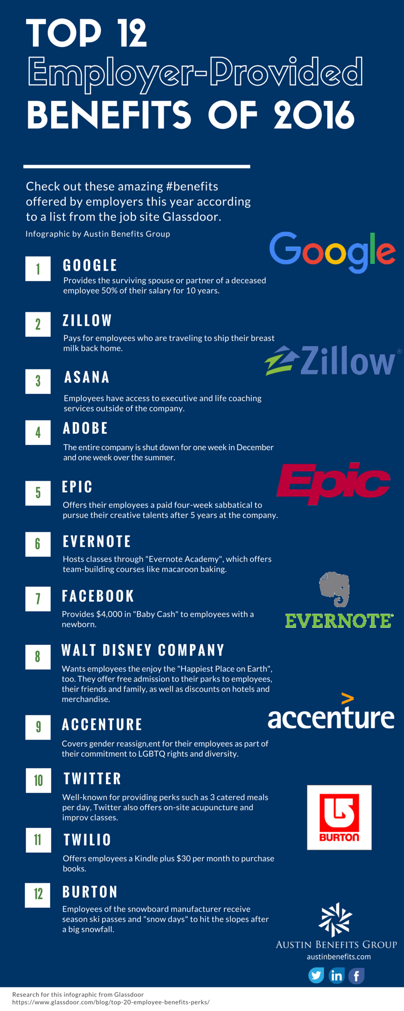 Benefits are a top recruiting tool and many companies are getting more and more creative with their total benefits package. Student-loan repayment has been trending recently among HR professionals, but here are some even more surprising benefits being offered to employees in 2016. Share this infographic online and check out our other infographics here.